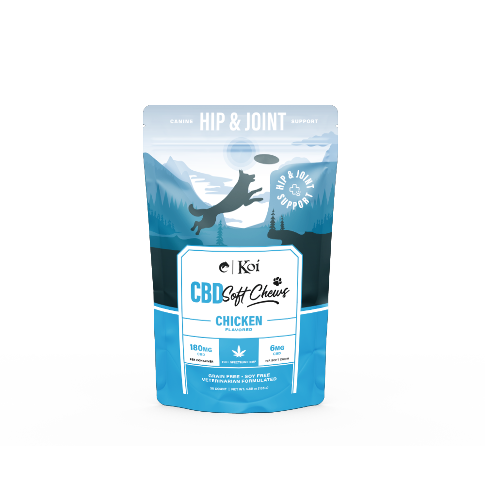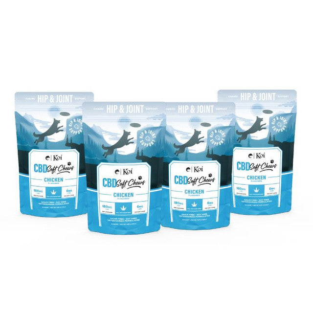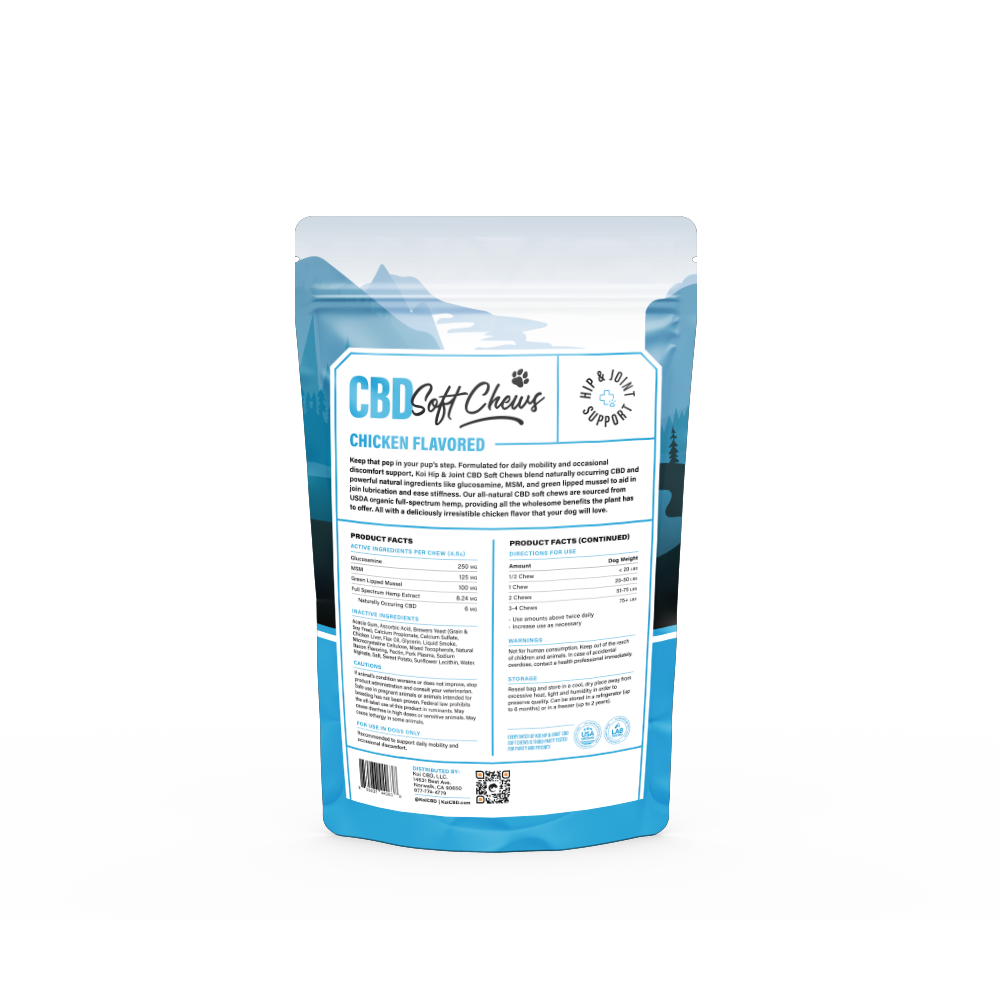 Unit price perKeep that pep in your pup's step. Formulated for daily mobility and natural relief support, Koi Hip & Joint CBD Soft Chews blend naturally occurring CBD and powerful natural ingredients like glucosamine, MSM, and green-lipped mussel to aid in joint lubrication and ease stiffness. Our all-natural CBD soft chews are sourced from USDA organic full-spectrum hemp, providing all the plant's wholesome benefits. All with a deliciously irresistible chicken flavor that your dog will love.
