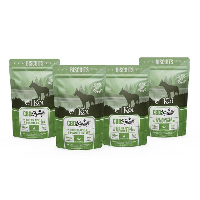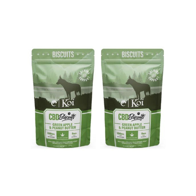 Unit price perHelp soothe your anxious or hyperactive dog’s worries with the help of hemp calming support. Koi Calming CBD Dog Biscuits contain an optimal, veterinarian-formulated blend of our Koi CBD full-spectrum hemp extract and natural chamomile, long used to support stress relief and relaxation. Delicious green apple and peanut butter flavors make our CBD calming dog biscuits a great addition to your pet’s wellness routine.