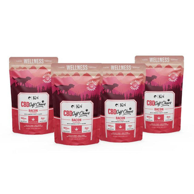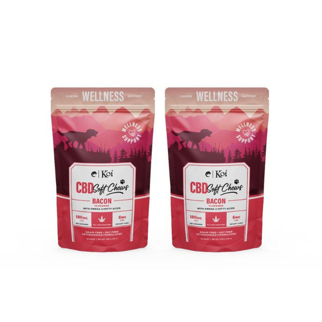 Unit price perA balanced and healthy dog is a happy dog. Koi Omega Hemp CBD Soft Chews deliciously deliver naturally occurring CBD with nourishing omega-3, omega-6, and omega-9 fatty acids to complement everyday wellness, encourage physical comfort, and promote a sense of calm. These all-natural CBD soft chews are sourced from USDA organic full-spectrum hemp, providing the plant's wholesome benefits. All this goodness comes in a tender chew with a crave-able bacon flavor that will make your pup flip.