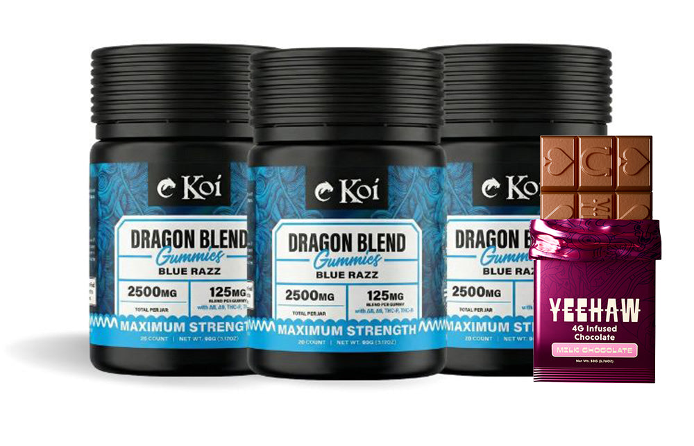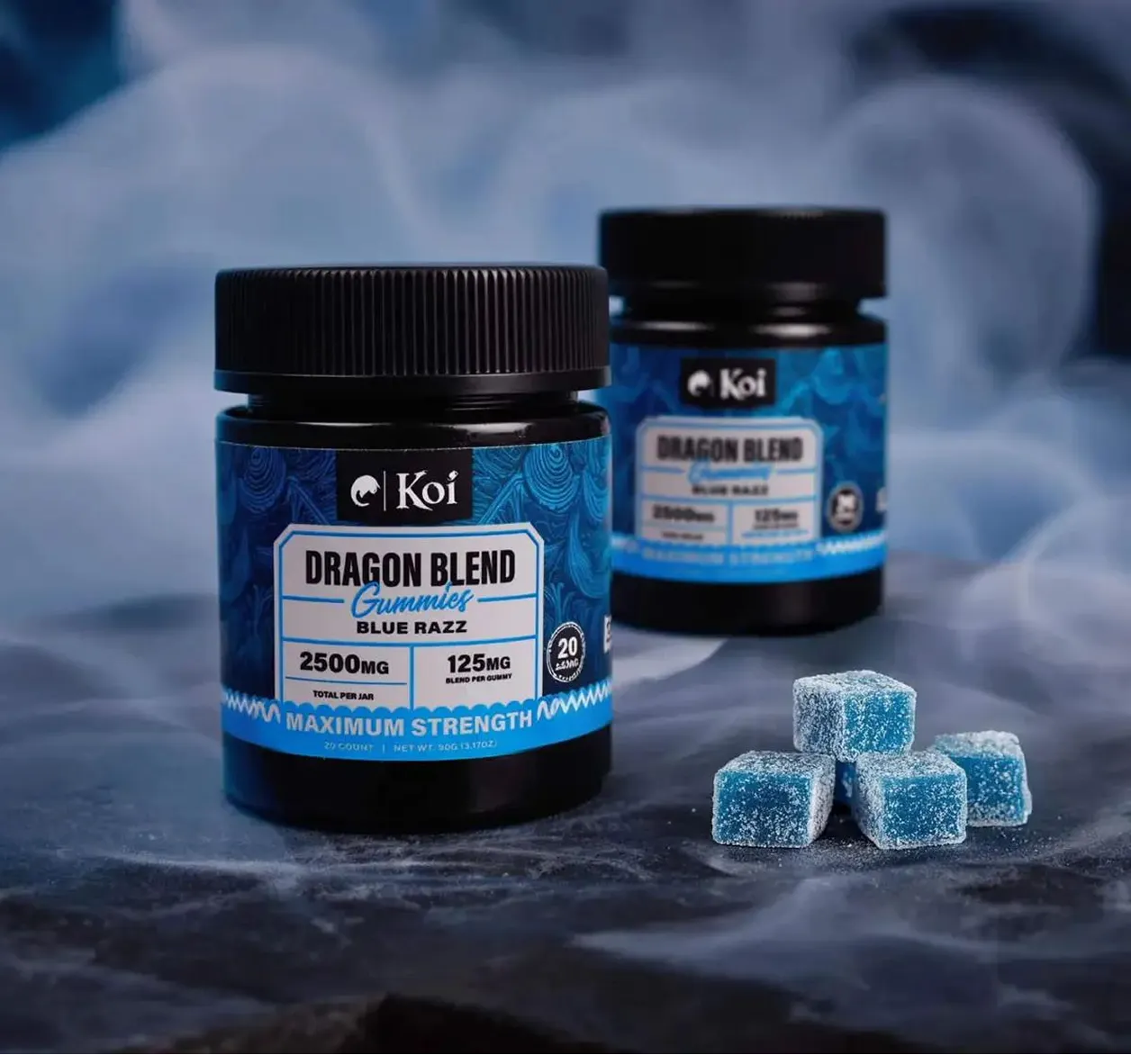 Unless you’re highly experienced, we recommend taking ¼ to ½ of a gummy your first time. Koi Dragon Blend Gummies are made with a powerful cocktail of 125 mg of Delta-8 THC, Delta-9 THC, HHC, and THC-P. This is significantly more potent than our delta-8 gummies and delta-9 gummies, as well as most other cannabinoid gummies on the market. Wait 90 minutes or more to feel the effects kick in before taking more.